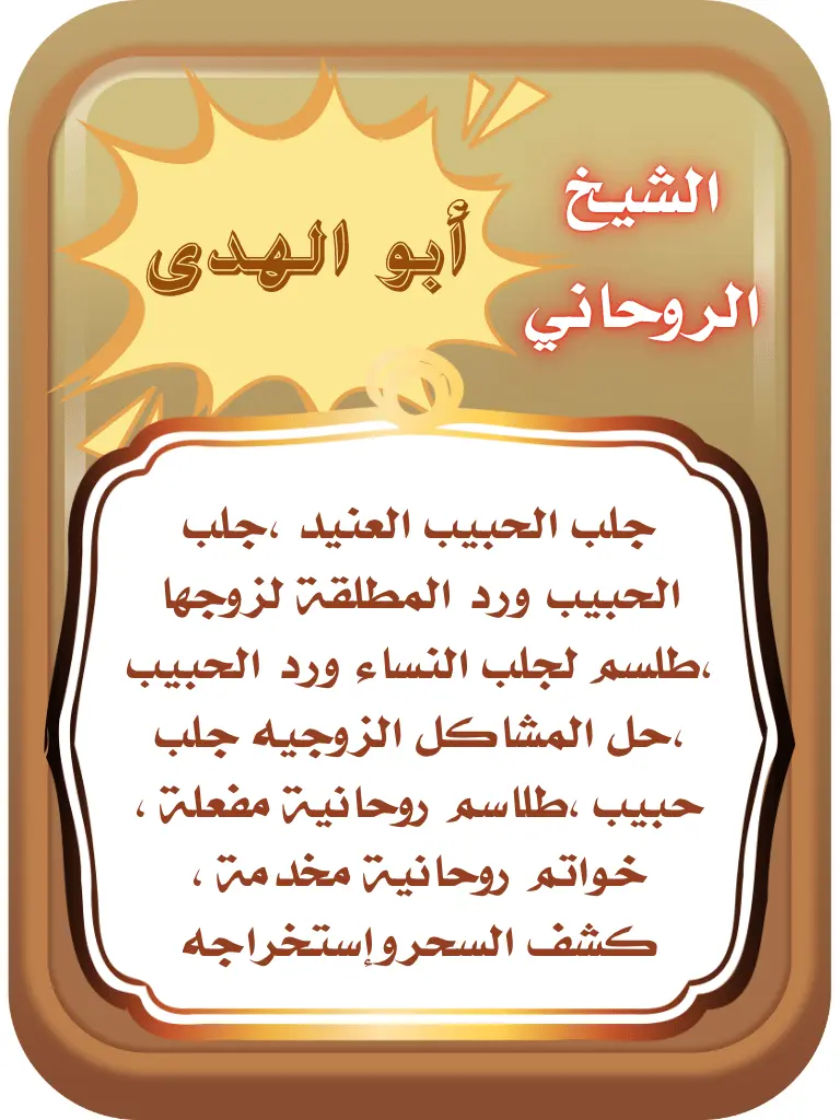 رقم شيخ روحاني مضمون جلب الحبيب بالطلاسم من أفضل أعمال الشيح الروحاني أبو الهدى والدفع بعد النتيجة والبرهان , شيخ روحاني مضمون , ومن أعمال الشيخة حل المشاكل الزوجية و رد المطلقة أو الحبيب .الرقية الشرعية فك جميع أنواع السحر والطلاسم الروحانية وعلاج المصاب بالعين والحسد لا تتردد بالأتصال الكشف مجاني لأي متصل